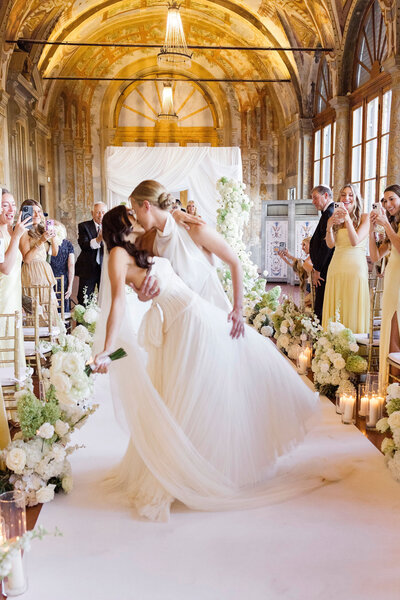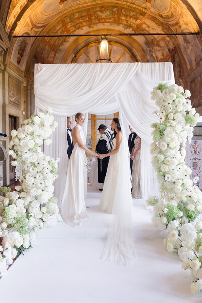 We're totally speechless as we look at the gallery of the villa set up for the ceremony. Frescoes, stained glass windows, and a cascade of flowers in shades of white and drapery provide the backdrop for this fantastic union.