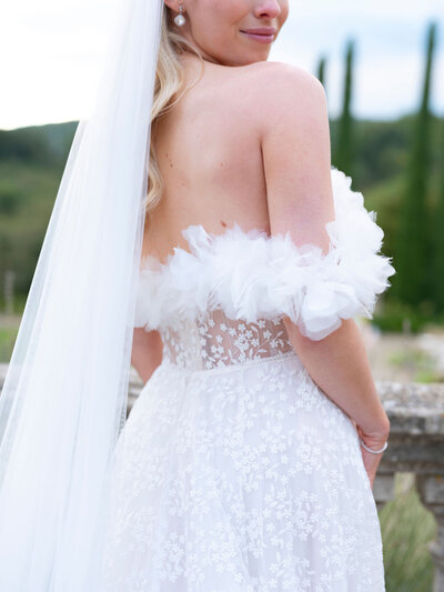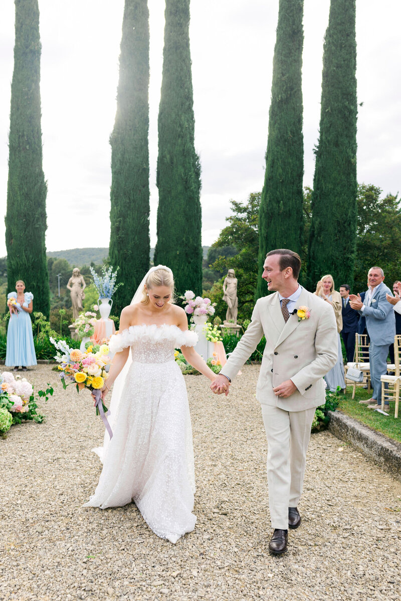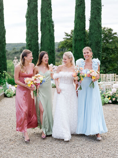 Manuelle and Robin created a unique experience for their guests, blending Italian traditions with cinematic elegance. Every detail was carefully curated to reflect the beauty and romance of this iconic Tuscan location. The event was a two-day wedding, with a fun and informal welcome dinner featuring traditional Italian food, followed by an elegant and emotional ceremony the next day — a perfect match!