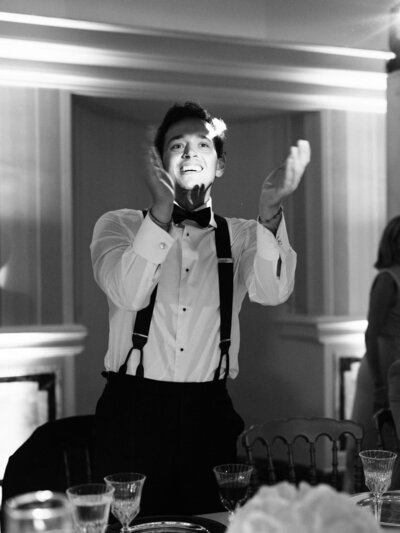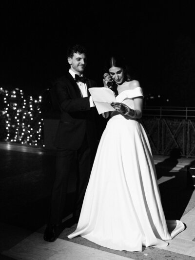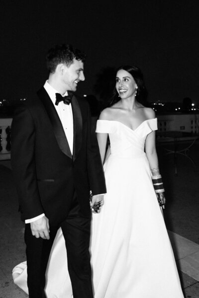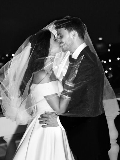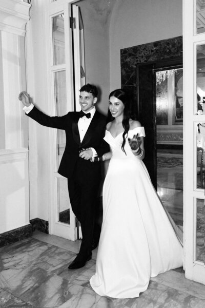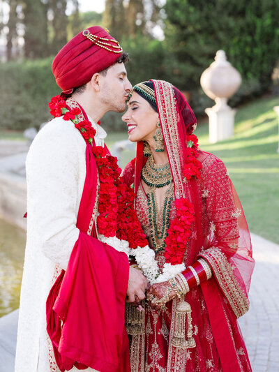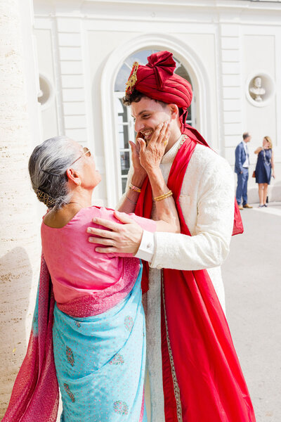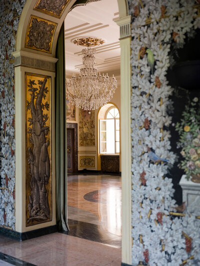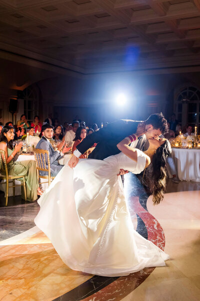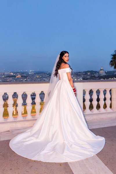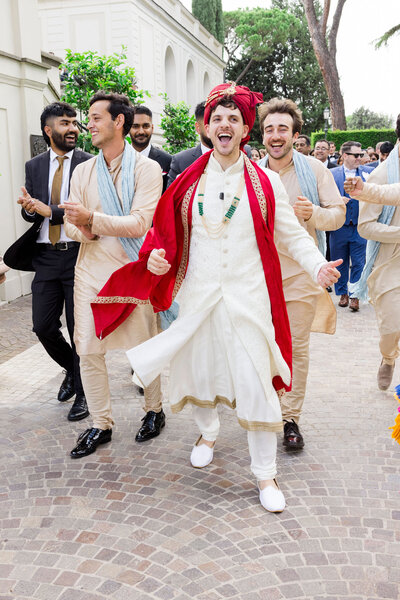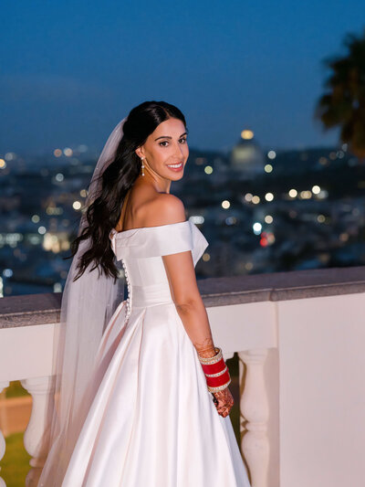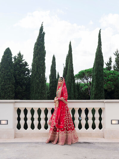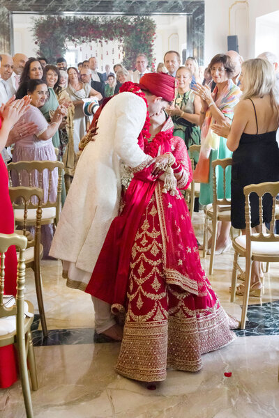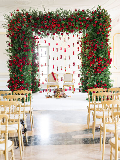 Anita and Alex's wedding took place in one of the most beautiful villas in Rome, Villa Miani, overlooking the Eternal City. The wedding was a union of two cultures, they were married with an Indian ceremony in the elegant white room of the villa, under a beautiful mandap decorated with an explosion of red roses. A colourful baharat preceded the ceremony with dance and music, and the groom was accompanied by his friends to the bride's family, where they exchanged gifts. After the ceremony, the bride and groom changed their clothes, this time into western wedding dresses. The reception was held in the stunning hall of the villa, with an elegant table setting, they started the evening with an emotional first dance.